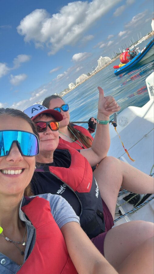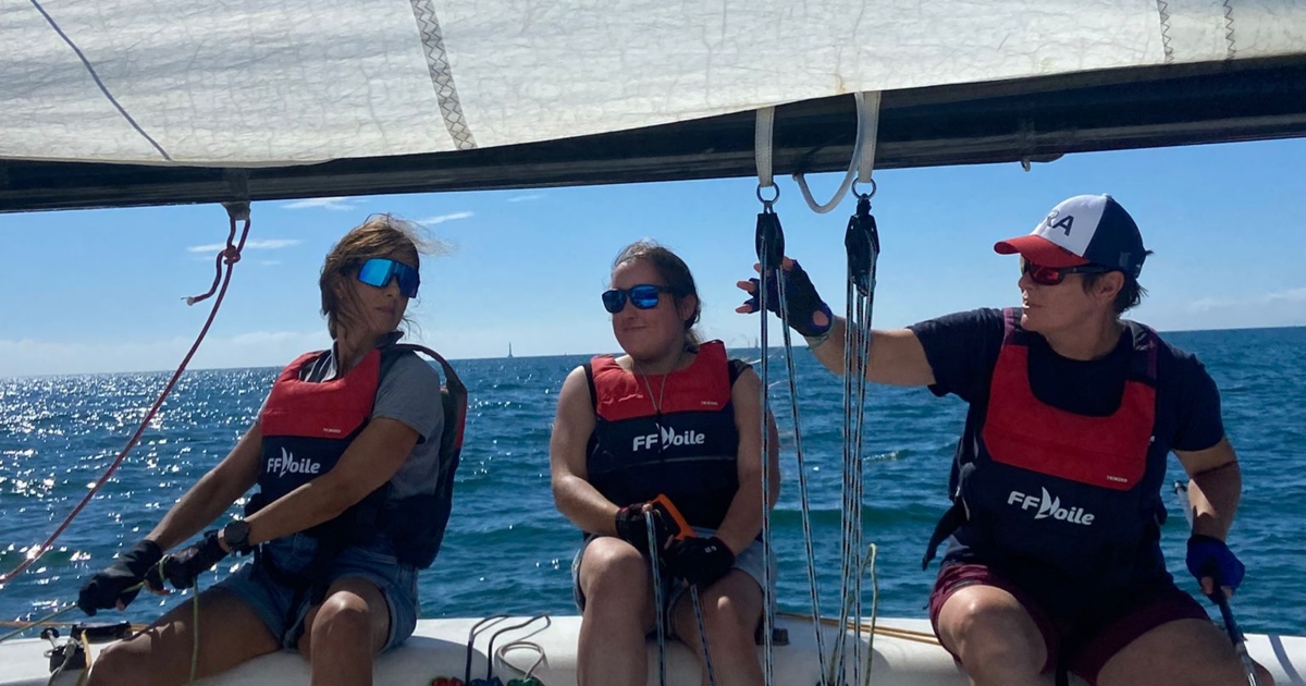 Le vent a eu du mal à se lever pour la deuxième journée, l’occasion de prendre le temps pour le briefing qui a été très instructif pour notre équipe. Le travail a continué sur les manœuvres : bear away, jibe set et ça s’améliore mais encore avec quelques couacs au moment de hisser le spi. Elles ont également profité de cette journée pour échanger les postes pour mieux se mettre à la place l’une de l’autre.